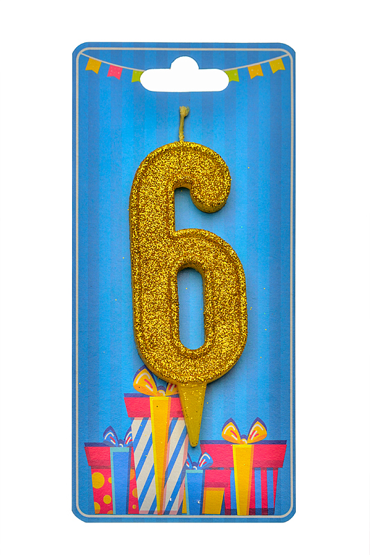 Свічка у формі цифри "6" відмінно підійде для декорування торта або інших десертівСвічку вироблено з якісного парафіну у формі цифри жовтого кольору, посипана зверху золотим глітером середньої фракції