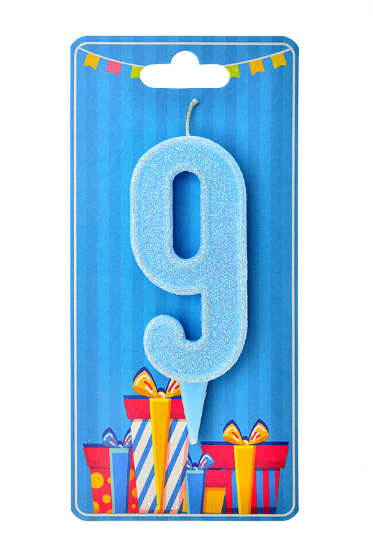 Свічка у формі цифри "9" відмінно підійде для декорування торта або інших десертівСвічку вироблено з якісного парафіну у формі цифри блакитного кольору, посипана зверху білим глітером середньої фракції