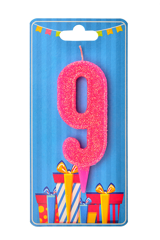Свічка у формі цифри "9" відмінно підійде для декорування торта або інших десертівСвічку вироблено з якісного парафіну у формі цифри рожевого кольору, посипана зверху рожевим глітером середньої фракції