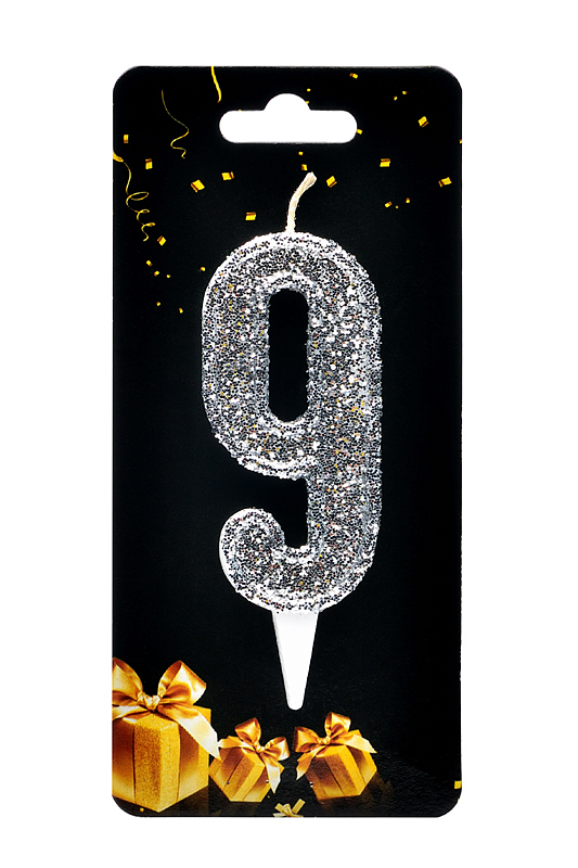 Свічка у формі цифри "9" відмінно підійде для декорування торта або інших десертівСвічку вироблено з якісного парафіну у формі цифри білого кольору, посипана зверху срібним глітером великої фракції