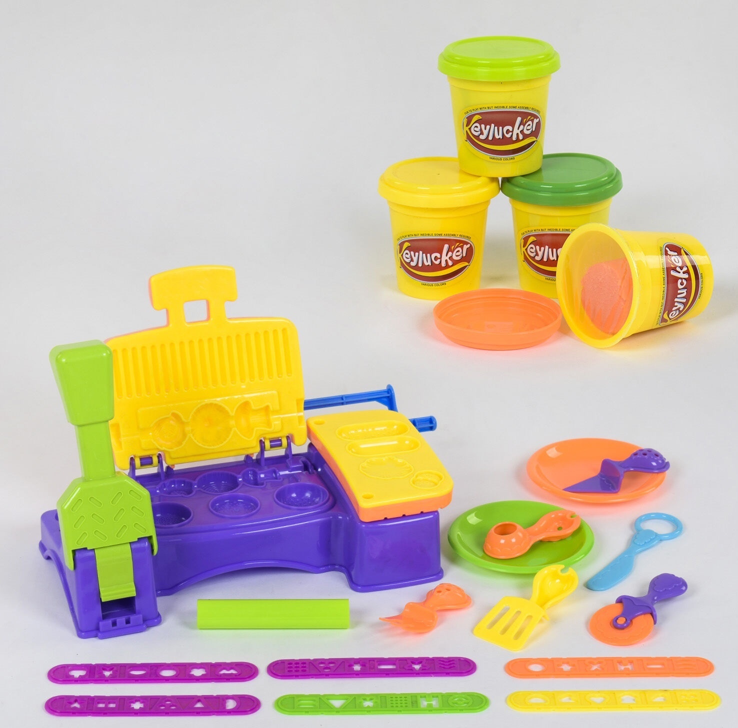 Тісто для ліплення - улюблена гра багатьох дітей у всьому світі. З появою класного матеріалу, який не липне до рук і не залишає незмивних плям на килимах і шпалерах, тісто для ліплення практично повністю витіснило звичайний пластилін.Набір тесту для ліплення КА 5016 являє собою захоплюючу гру, в процесі якої, дитина зможе влаштувати справжню барбекю вечірку, правда продукти не можна буде з'їсти. Величезна кількість формочок, посуду і ціла установка для приготування барбекю стануть відмінним варіантом для подарунка, як дівчинці, так і хлопчикові.