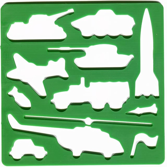 Трафарет дуже зручний у використанні як для дошкільнят, так і для дітей початкових класів. На ньому зображені різні фігурки машин та літаків. Такий трафарет допоможе у розвитку навчання дитини та розпізнаванні військової техніки.
