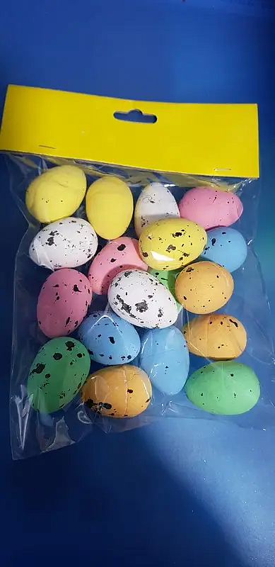 Яйця виконані з пінопласту. Довжина яйця 4,0 см. В упаковці 18 яєць різних кольорів. Такий декор допоможе завершити Вам пасхальне декорування.