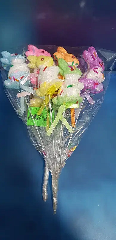 У прозорому пакеті шість кролів на довгій шпажці. В упаковці різні забарвлення сувенірів. Такі кролики допоможуть Вам створити святковий настрій на Великдень.