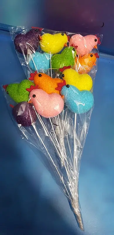 У прозорому пакеті шість курчат на довгій шпажці. В упаковці різні забарвлення сувенірів. Такі курчата допоможуть Вам створити святковий настрій на Великдень.