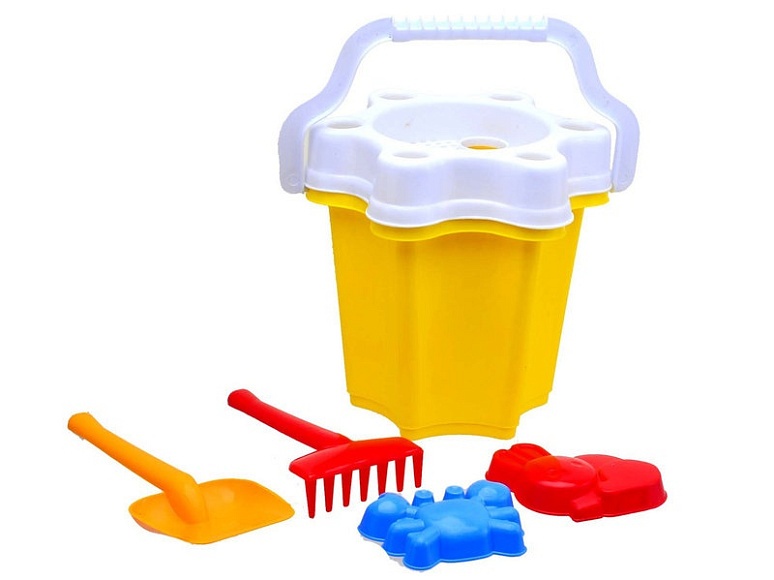 Відерце із набором , є незамінною іграшкою для діток у будь-яку пору року, набір є голубого, рожевого, зеленого,жовтого та червоного кольорів. Відерце має форму квітки та має зручну пластикову ручку тому кожний малюк зможе переносити будь- які предмети без перепон. Доповненням є ще пасочки а також грабельки та лопатка, які закріплені підставкою. Такий набір стане улюбленої іграшкою у пісочниці.