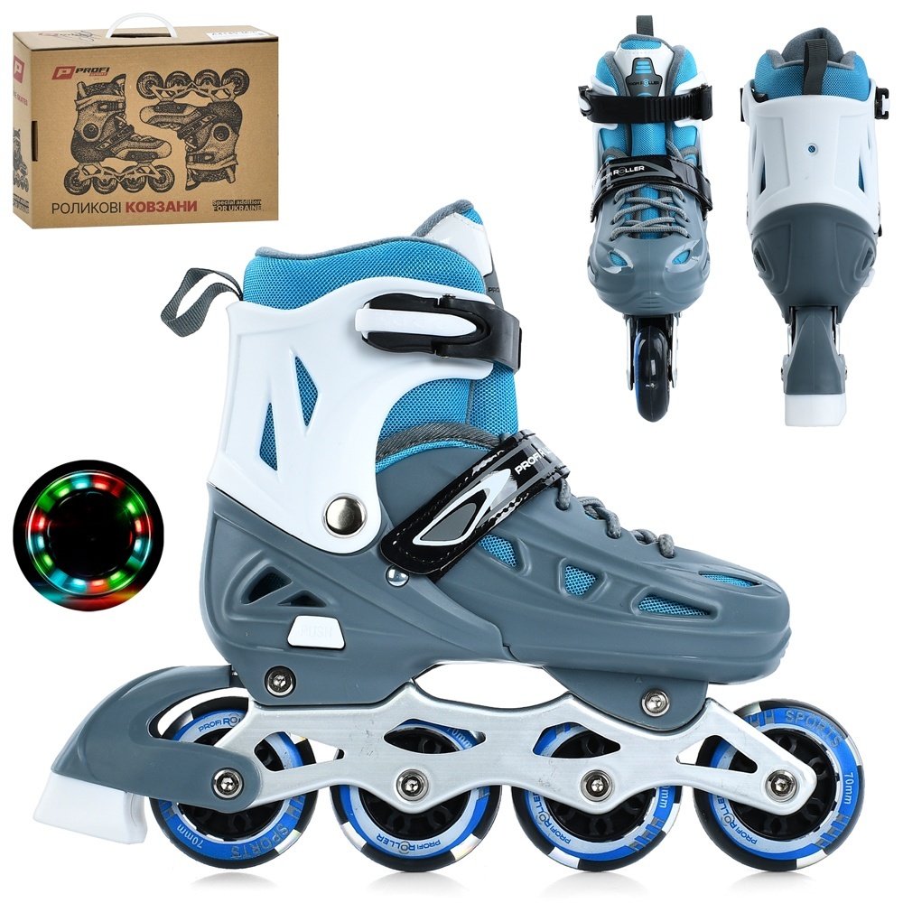 Ролики A4153-M (35-38) розсув.,шнур.+бакля,алюм.рама,ABEC-7,кол.ПУ70мм,3кольори,уст.21см,світло,кор.