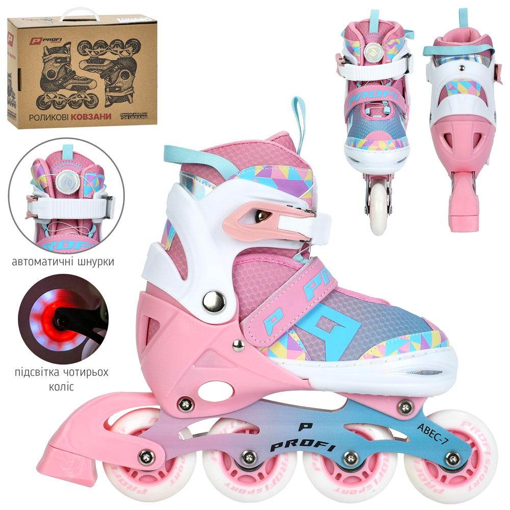 Ролики A4156-M-P (35-38)розсувні,шнурівка+бакля,алюм.рама,ABEC-7,колеса ПУ70мм,світло,зібрані,рожев.