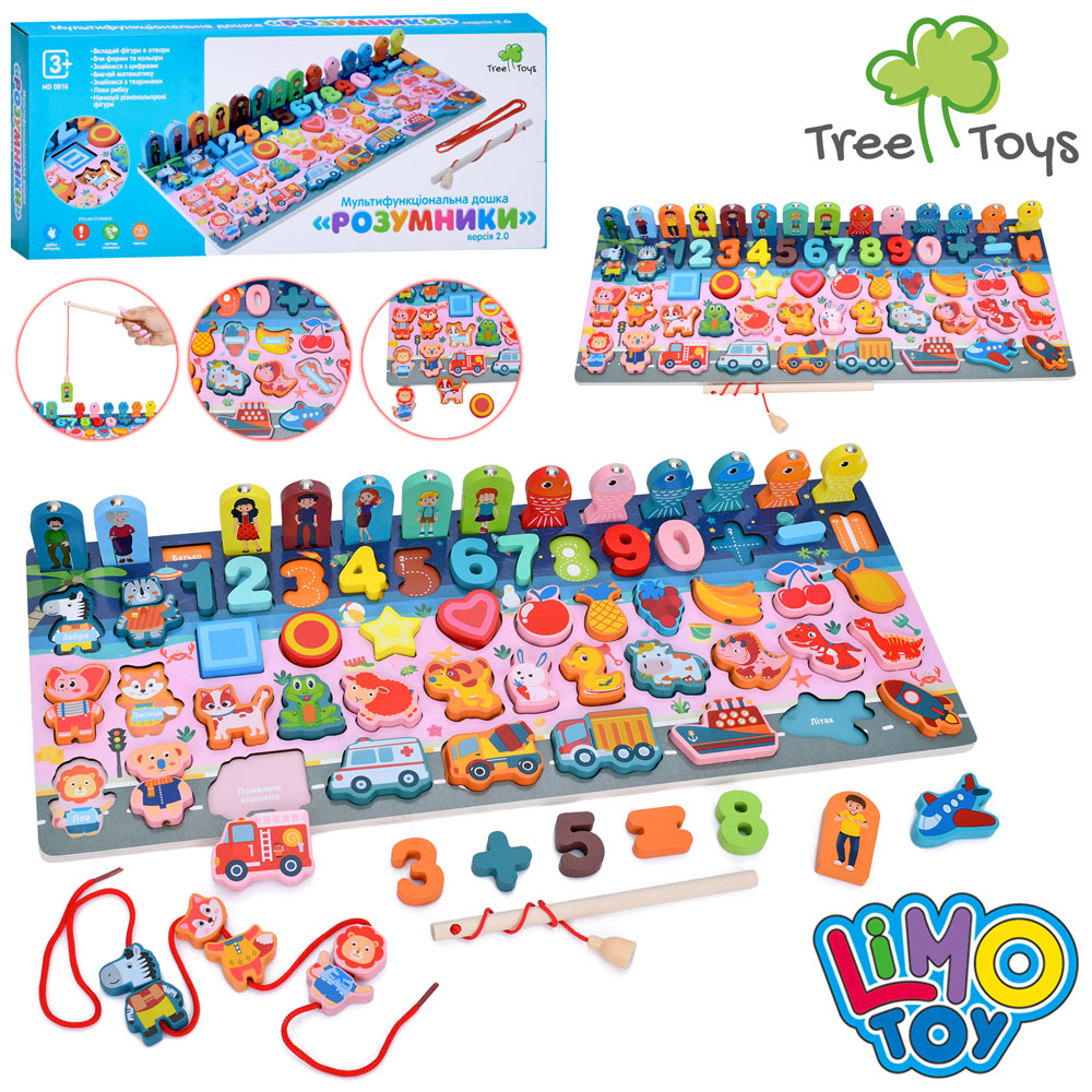 Дерев'яна іграшка Багатофункціональна дошка MD 0820 цифри,слова англ.,тварини,фігури,кільця,риболовл