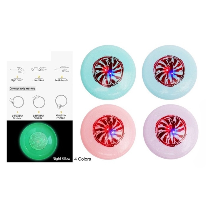 Літаюча тарілка MR 1348 фрісбі, світиться у темряві, 4 кольори, світло, бат.(табл.),кул.,15-15-2,5см