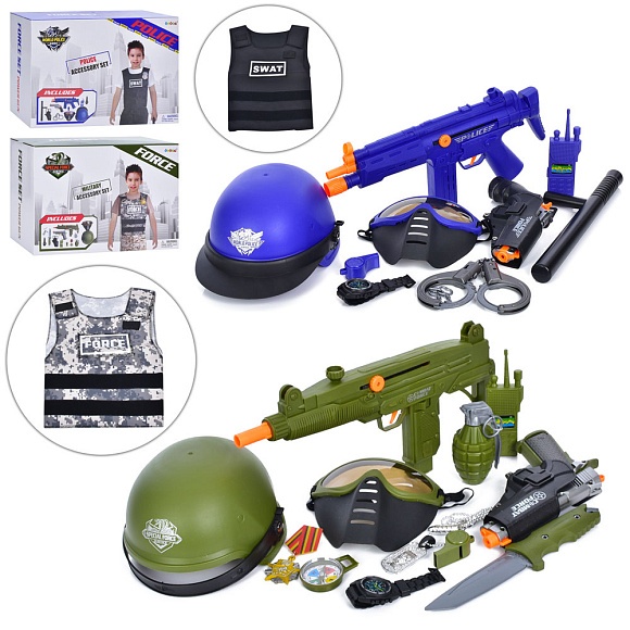 Опис Набір зі зброєю 36330-40 (9шт) трещітка, автомат 37см, пістолет/револьвер (звук,світло, на бат-ці табл), жилет, каска, 2 види, в кор-ці, 37-26-12,5см