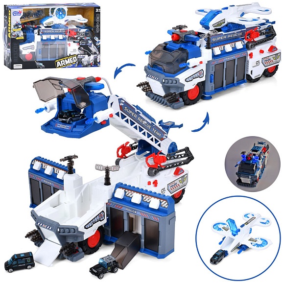 Опис Набір з транспортом YY6032P поліція,трейлер-база,бризкає водою,літак,кулі,машинки-мет.,муз., світло,