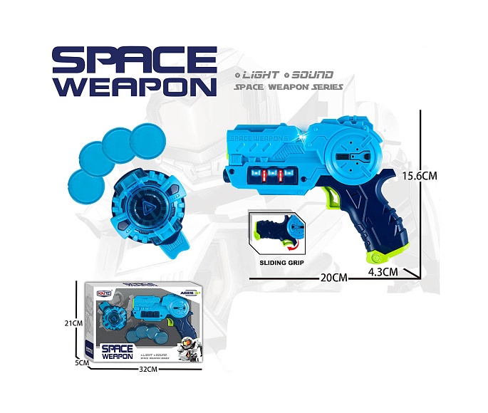 Опис Набір зброї kt218-61 бластер, пусковий набір-дискомет, диски 4 шт.,муз.,світло,бат.,кор.,32-21,5-7см