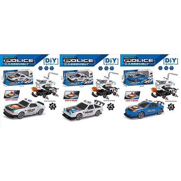 Конструктор 8811-1-2-3 на шурупах,машина 21см,поліція,звук,світло,гайк.ключ,3 види,бат(табл), в кор.