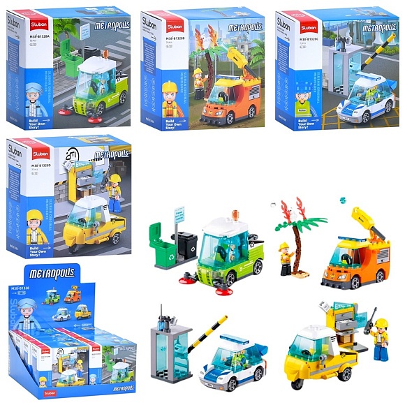 Опис Конструктор sluban m38-b1328 міська серія, машина/спецтехніка, від 73дет.,кор.,8шт.(4 види) в диспл.