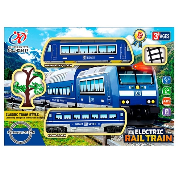 Опис Залізниця JHX5617 локомотив, 1 вагон, муз., світло, дерево, 15 дет., бат., кор., 36-25-6,5 см.
