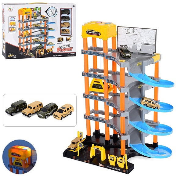 Опис Гараж P9488A-2 5 поверхів, ліфт, машинки 4 шт., світло, бат., кор., 48-36-9,5 см.