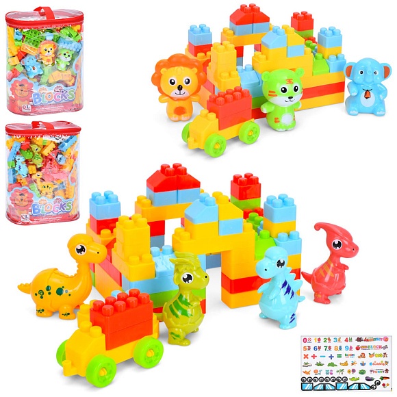Конструктор 1678-56-57 блоки, фігурки, наліпки, 2 види (динозаври, тварини), сумка, 21-26-12 см.