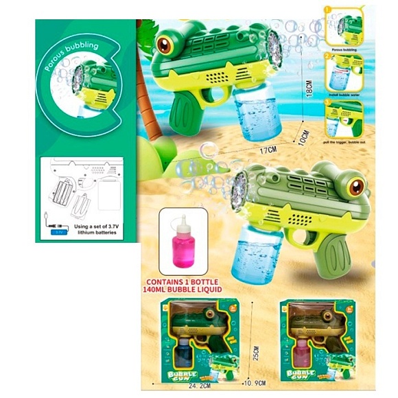 Опис Мильні бульбашки 25013b пістолет-крокодил,9,5см,світло,акум,usbзарядне,запаска, в кор-ці24,5-25-11см