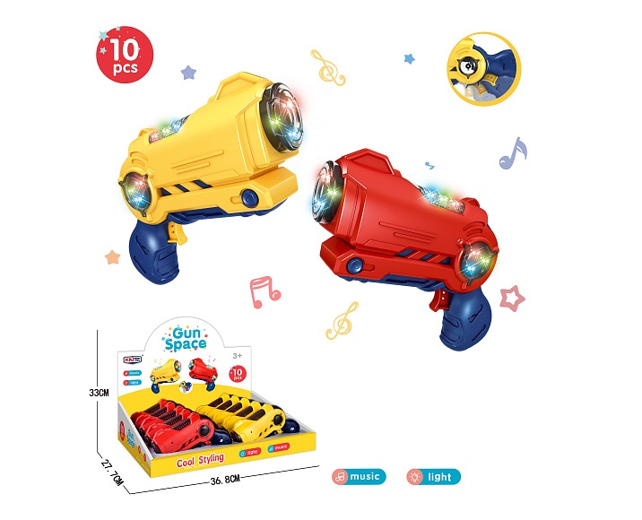 Опис Пістолет kt318-10 бластер, муз., світло, бат. (табл.), 10 шт. (2 кольори) в диспл., 38-10-28,5 см.