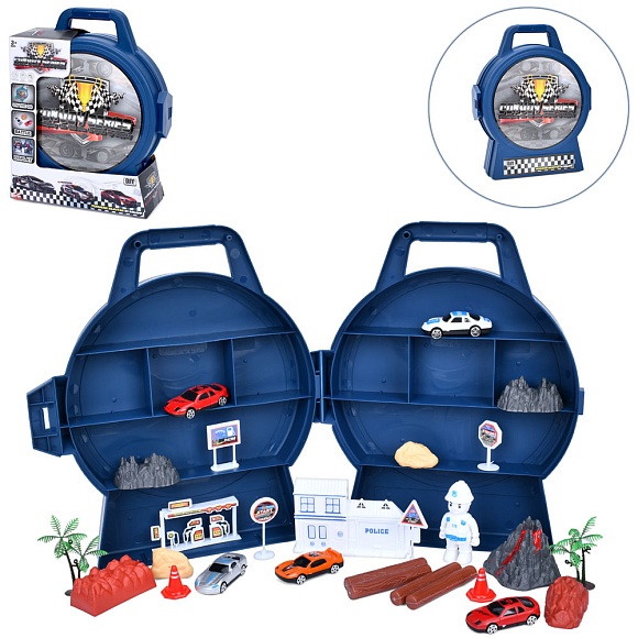 Опис Набір з транспортом F777-A2 чемодан-гараж, машини, фігурка, дорожні знаки, кор., 26,5-34-8,5см.