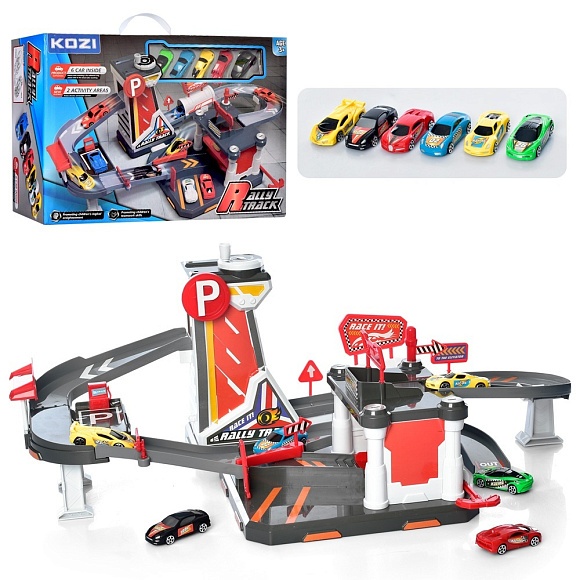 Опис Гараж QL907 2 поверхи, підйомник (механіч.), машинки 5шт., дорожн.знаки, кор., 50-36-14см.