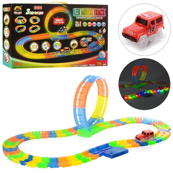 Опис Трек GD-152A світиться в темряві,315см.,оберт.360, машинка,118дет.,муз.,світло,бат.,кор.44-27,5-7см.