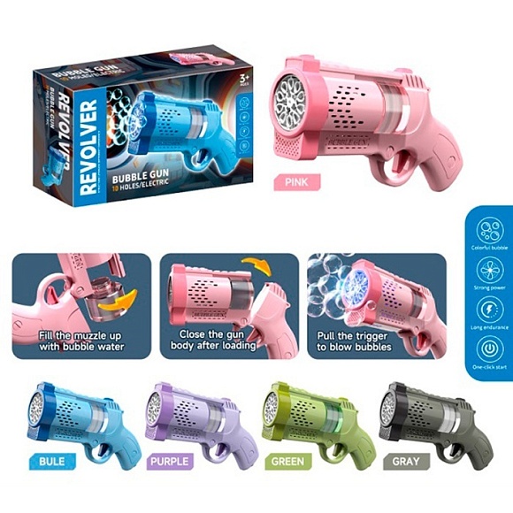 Опис Мильні бульбашки 029A пістолет, світ,запаска.мікс кольорів,бат,кор.23,5-14-6,5см