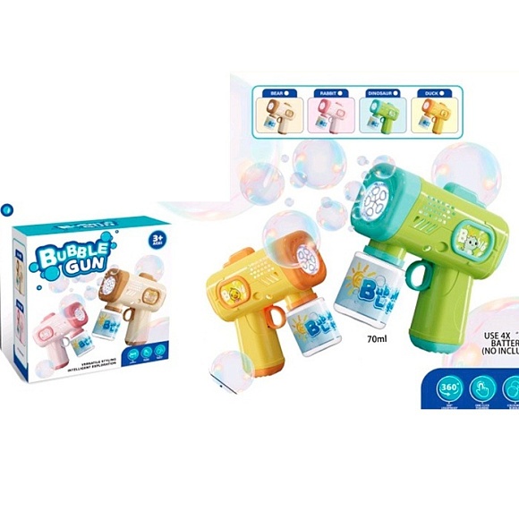 Опис Мильні бульбашки ME-239 (36шт) пістолет, 13см, світло, запаска 7-4,5см, 4 кольори, на бат-ці, в кор-ці, 13,5-13,5-6см