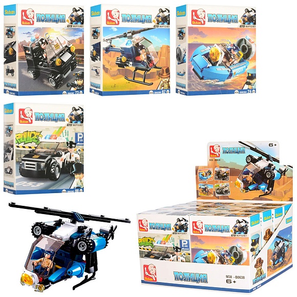 Опис Конструктор SLUBAN M38-B0638 поліція, трансп., фігурка, від 73 дет., 8 шт. (4 види) в диспл., 28,5-1