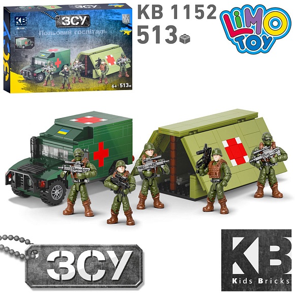 Опис Конструктор KB 1152 військовий,польовий госпіталь(машина, намет),фігурка 5шт.,513дет.,кор.,32-22-6см
