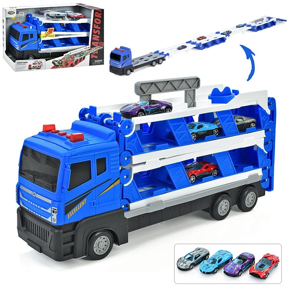 Трейлер D663-T204B інерц., машинка 4 шт., рухомі деталі, муз., світло, бат.(таб.),кор.,41-23-12см.