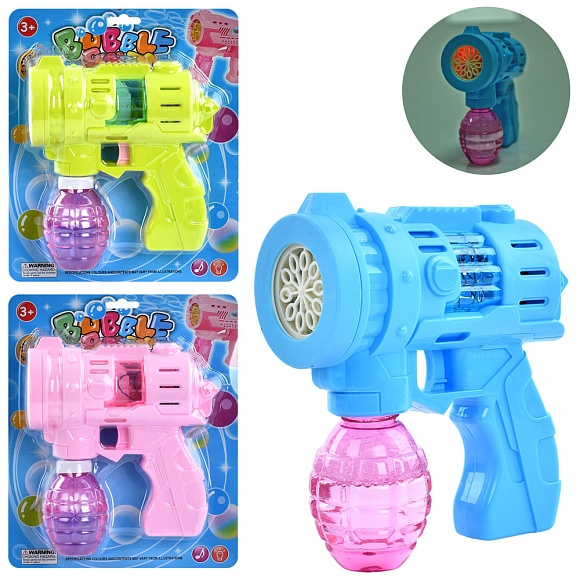 Опис Мильні бульбашки 2088-32 пістолет/бластер, запаска, 3 кольори, муз., світло,бат.,бліст.,22,5-26-7см.