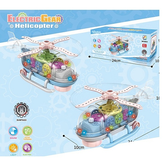 Опис Гелікоптер 8819 їздить, рухливий гвинт, шестерні, 2 кольори, муз., світло, бат., кор., 24,5-10-10 см