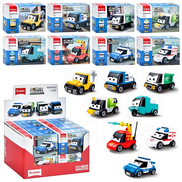 Опис Конструктор SLUBAN M38-B1072 машинки, інерц., від 37дет., кор., 16шт. (8 видів)в диспл.,28,5-19-19см