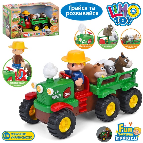 Трактор M 6303 з причепом, 25,5см, музика/звук (укр), світло, їздить, знімна фігурка,,на бат. в кор.