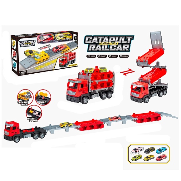 Опис Трейлер 708-899B інерція, 22см, гумові колеса, 2в1(трек 90см),машинка7см2шт,в кор-ці29-16-8,5см