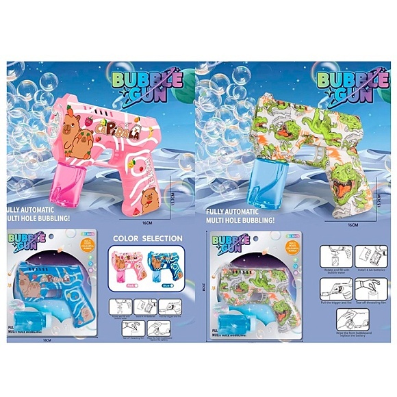 Опис Мильні бульбашки 2033-1-4 пістолет 16,5см, запаска7-3,5см,капібара,динозавр на бат.бліст.18-21-4см