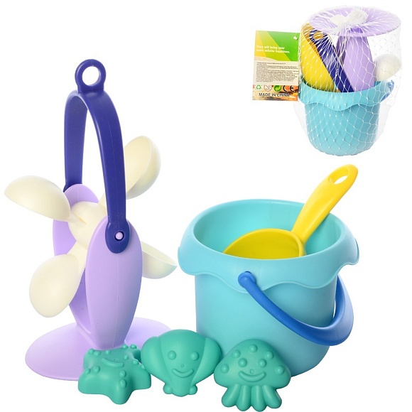 Опис Набір для пісочниці HG-771 відерце, лопатка, млин, формочки, м'який, сітка, 18-13-12 см.