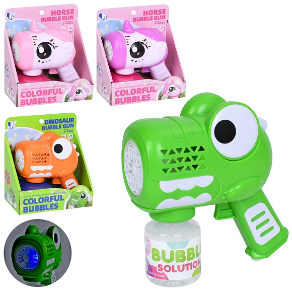 Мильні бульбашки P82358-68 пістолет,світло,запаска.2 види(динозавр,єдиноріг)мікс кольор.бат.кор.