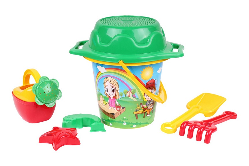 У набір для гри в піску входять: відро, сито, формочки, лопатка, грабельки і лієчка.