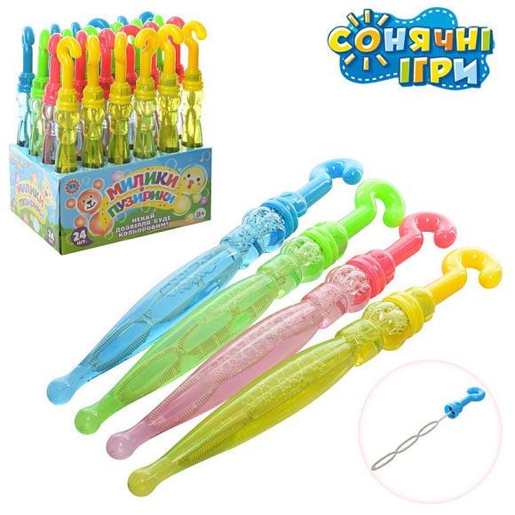 Опис Мильні бульбашки 2800u меч, парасолька, 24 шт. (4 кольори) в диспл., 21-14-26 см.