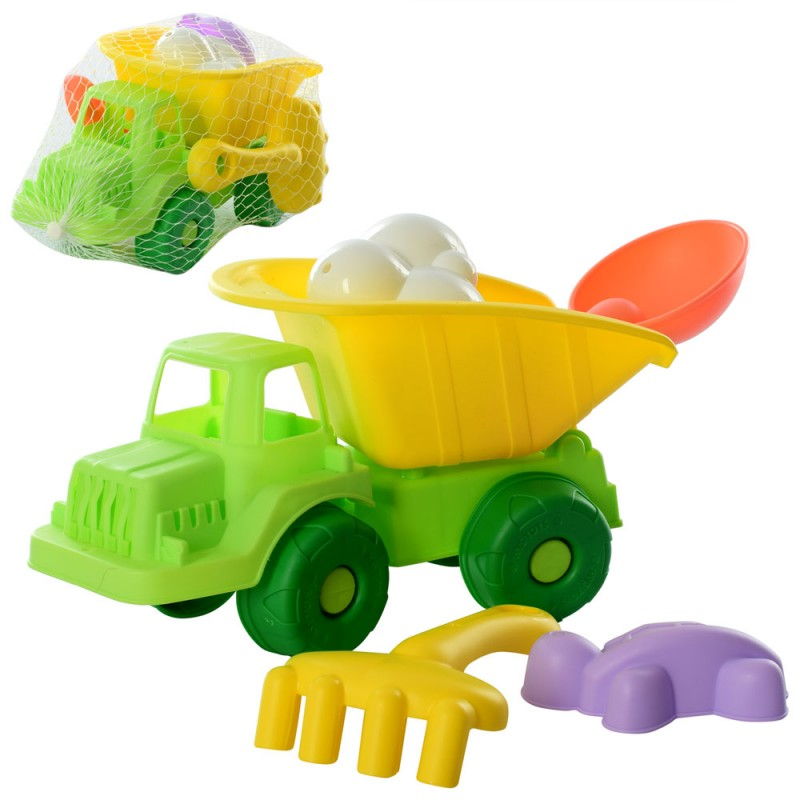 Опис Набір для пісочниці HG-861 машинка, граблі, лопатка, формочки, сітка, 25-14-14 см.