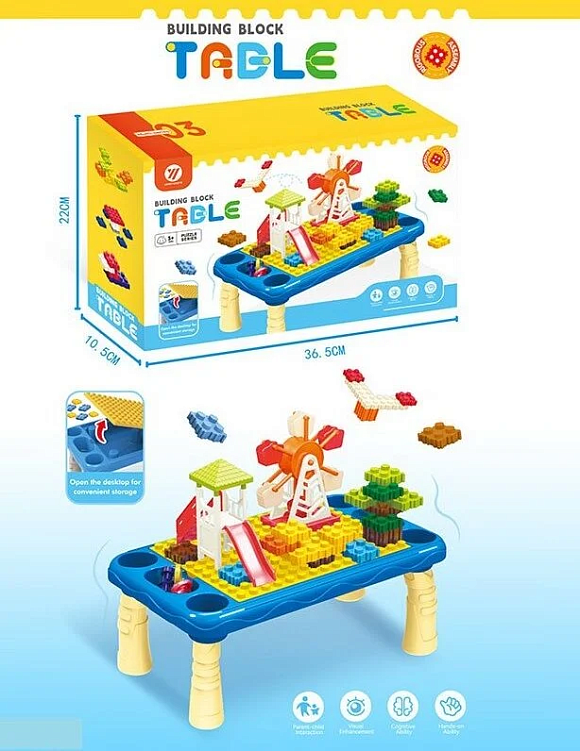 Столик із конструктором стане чудовою ігровою зоною для маленького будівельника! На яскравій поверхні дитина може поєднувати деталі так, як забажає. Кришка столика відкривається, тож усі елементи зручно зберігати всередині. Такий набір розвиває моторику, уяву й посидючість, даруючи яскраві враження від кожної гри.Особливості: