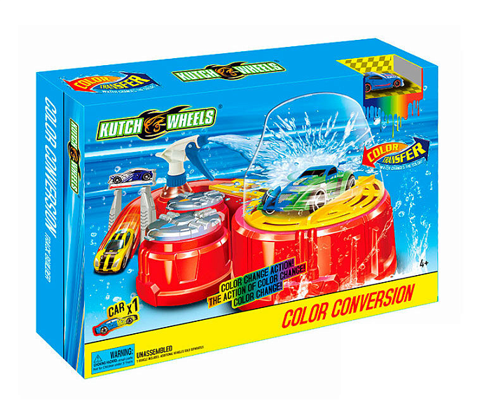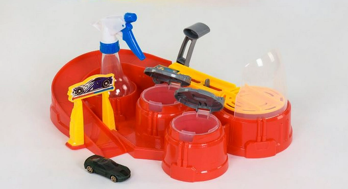 Збери свою власну майстерню для фарбування машин! Особливістю іграшки є можливість використання води в процесі гри.Гра складається з обертової поверхні з захисним екраном і водозбірником, а також з двох резервуарів для гарячої та холодної води та бластера-розпилювача. Потрапляючи на платформу, машинка може бути перефарбована в інші кольори за допомогою спеціального розпилювача води, які швидко перемикаються між двома резервуарами з водою.